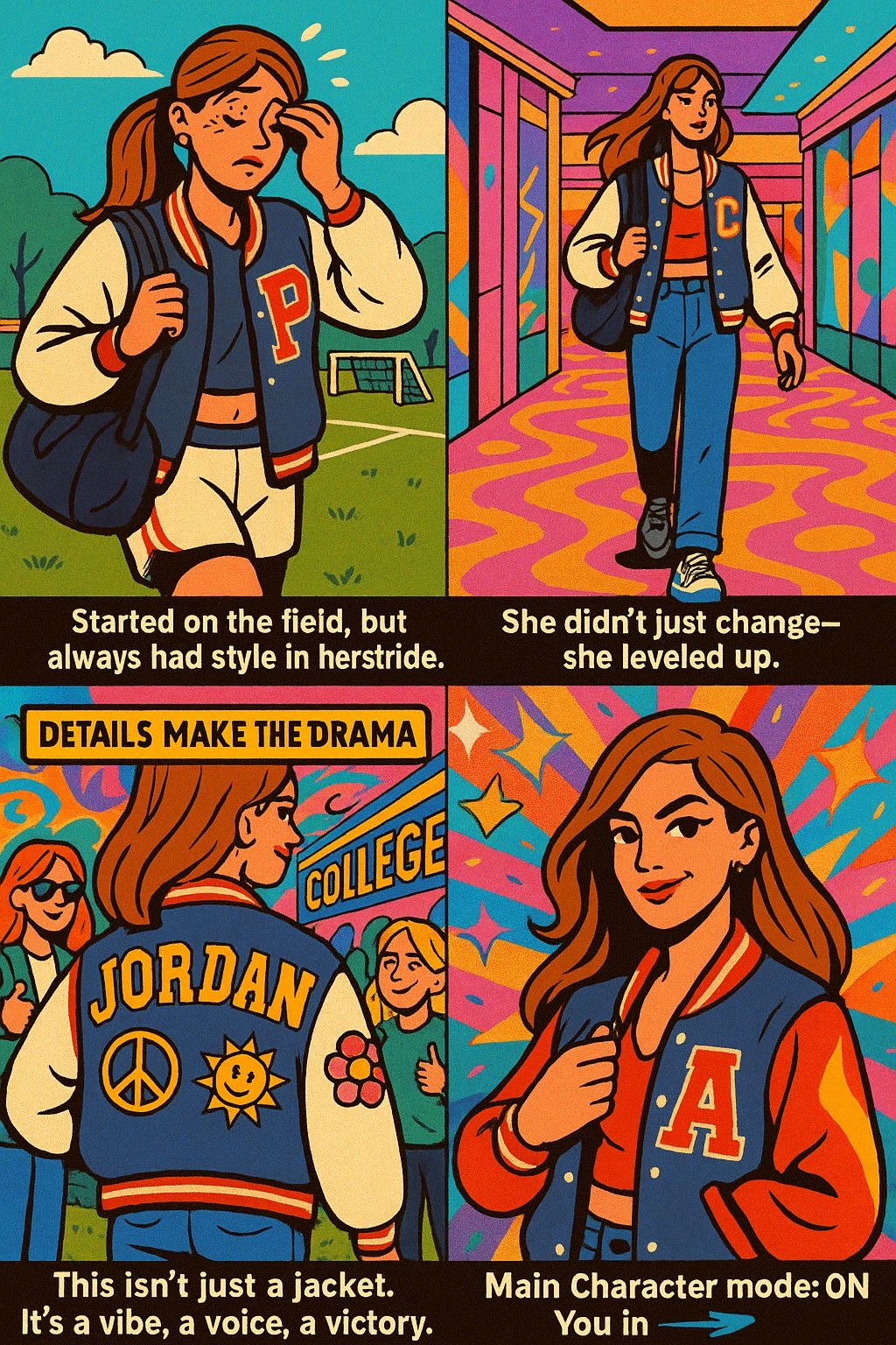 This vibrant comic illustration tells the story of personal evolution through style. From athlete to icon, the character’s transformation is anchored by the varsity jacket, a symbol of identity, growth, and confidence. With bold colors, nostalgic references, and empowering lines like “Main Character mode: ON,” the artwork celebrates how fashion can elevate everyday moments into powerful statements. It’s not just about the jacket, it’s about the journey.